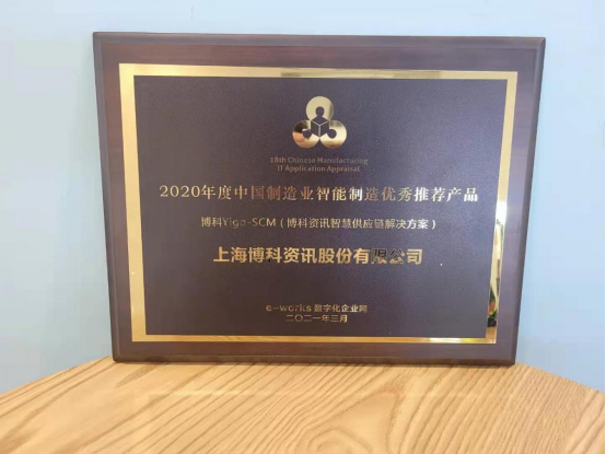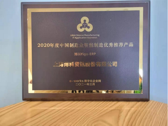 3月25-26日,由e-works数字化企业网主办的“2021(第十届)中国智能制造高峰论坛暨第十八届中国智能制造岁末盘点颁奖典礼“在北京顺利召开,博科Yigo-ERP产品和Yigo-SCM供应链管理产品在本次评选中脱颖而出,荣获了“2020年度中国制造业智能制造优秀推荐产品”,博科资讯荣获“2020中国数字化转型解决方案优秀供应商”称号。