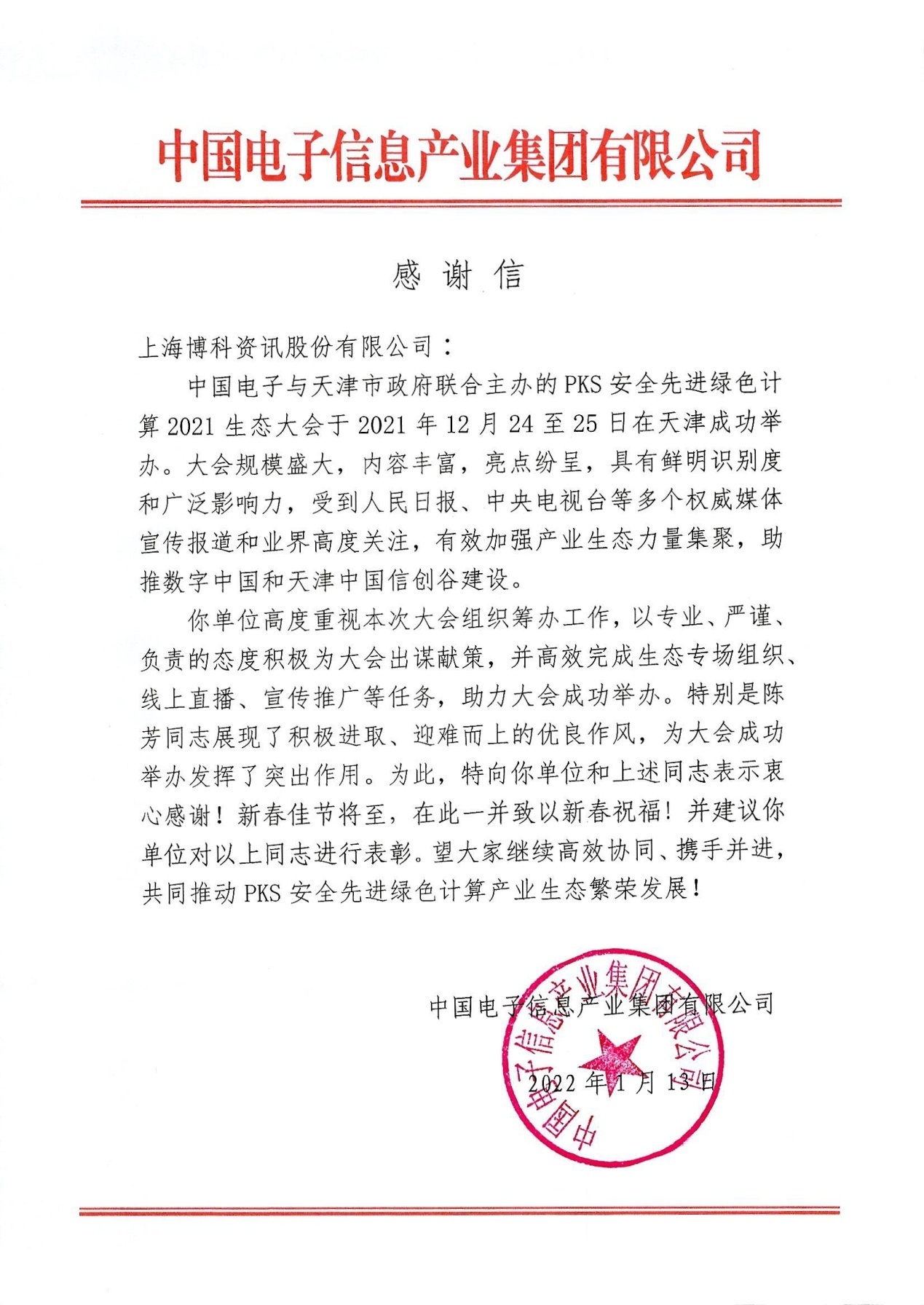 本次收到中国电子及中电创新院的感谢信,收获的不仅是一份荣誉,更是一份责任!未来,博科资讯将积极参与中国电子PKS生态建设行动,为实现“自主、安全、可控”,配合“关基领域”软硬件的国产化步伐而前行,共同推动中国安全先进绿色计算产业生态繁荣发展!