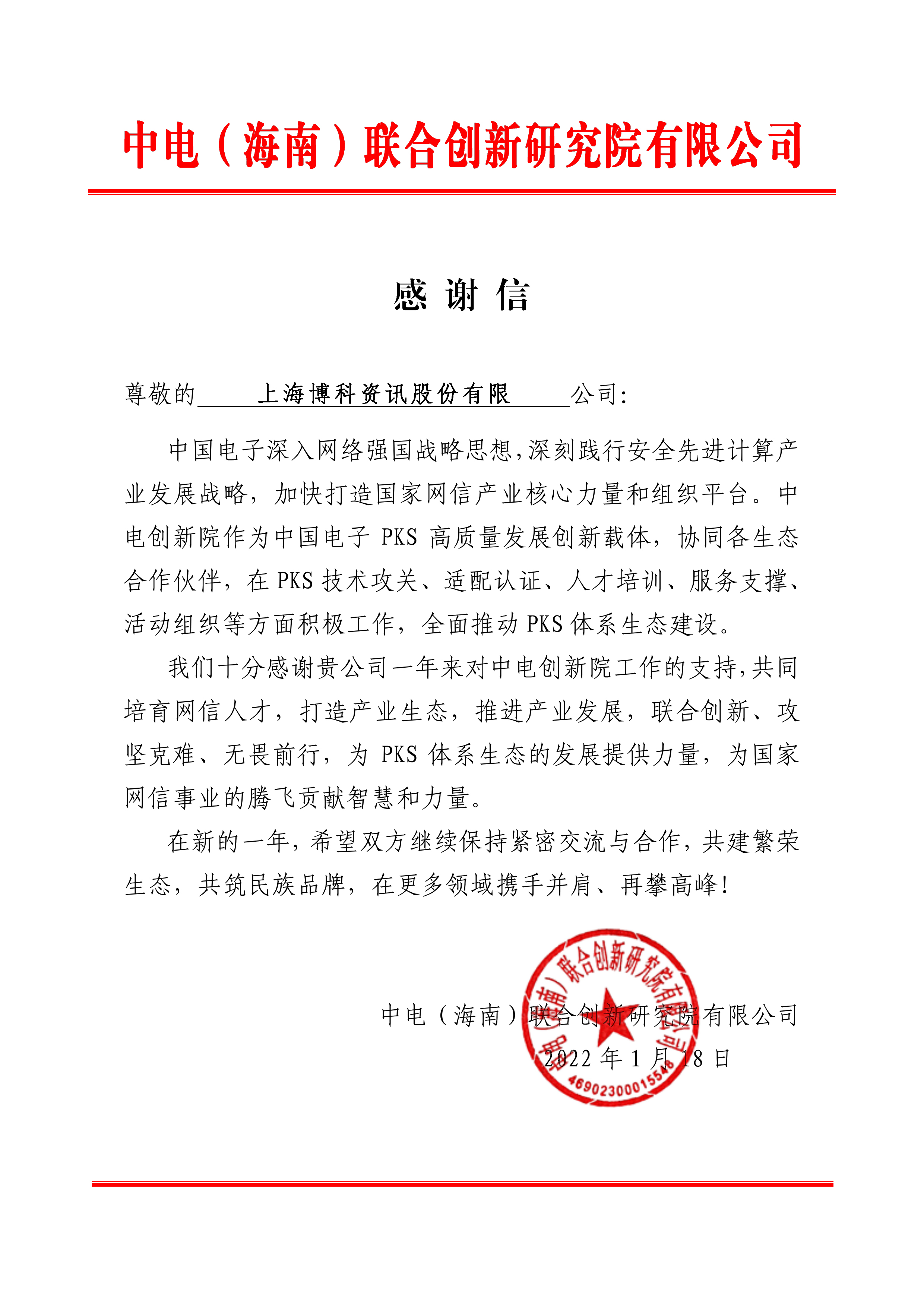 十分感谢博科资讯一年来对中电创新院工作的支持,共同培育网信人才,打造产业生态,推进产业发展,联合创新、攻坚克难、无畏前行,为PKS体系生态的发展提供力量,为国家网信事业的腾飞贡献智慧和力量!”