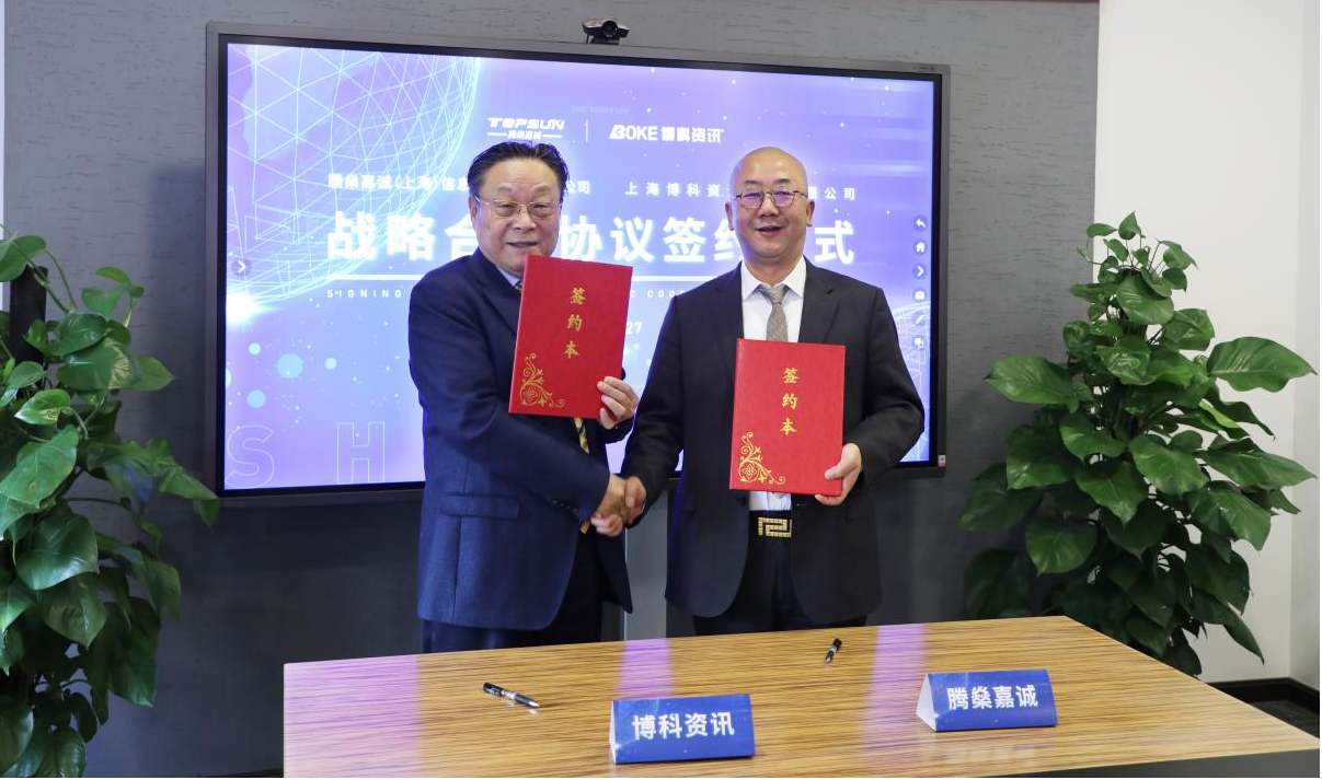 近日,上海博科资讯股份有限公司(以下简称“博科资讯”)与腾燊嘉诚(上海)信息科技股份有限公司(以下简称“TOPSUN”)在上海签订战略合作协议。博科资讯董事长沈国康、渠道总监范卫华,TOPSUN董事长晚钟、总裁李毅涛、高级副总裁刘步阶出席了签约仪式。